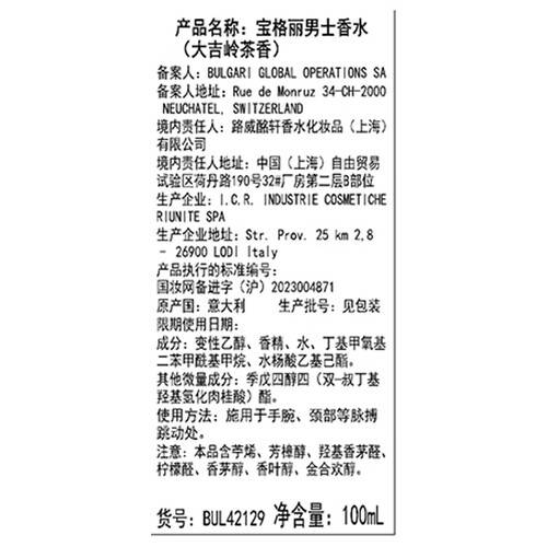 宝格丽男士香水(大吉岭茶香)则是专为现代男士设计的高端香水。其独特的茶香调,给人一种清新、优雅的感觉,适合日常使用及正式场合。容量同样为100ml,适合注重个人形象的男性使用。