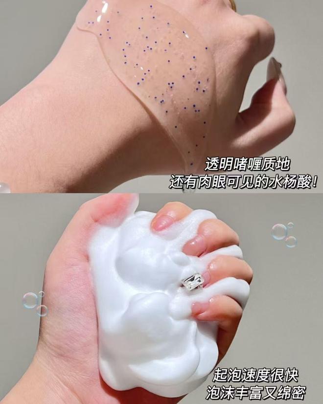 质地为乳白色乳霜状,遇水轻轻揉搓即可产生绵密且有弹性的泡沫,上脸触感柔和;冲洗时泡沫易被清水带走,无假滑感。